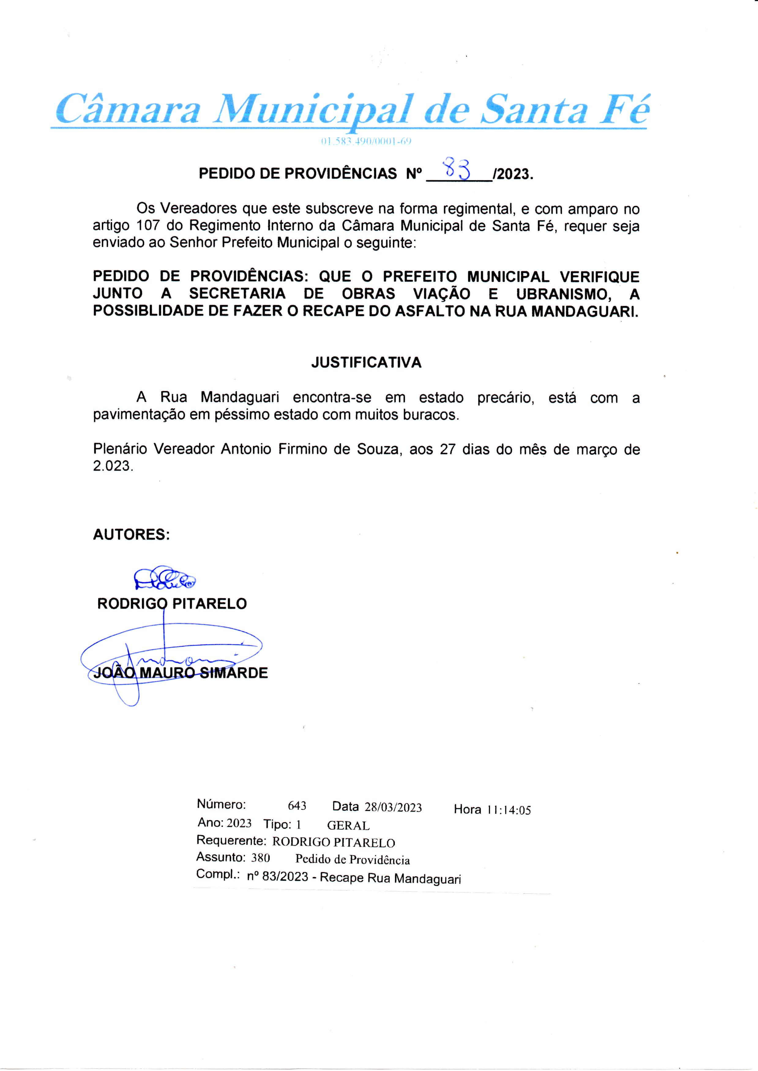 Que o Prefeito Municipal verifique junto a Secretaria de Obras, Viação e Urbanismo, a possibilidade de fazer o recape do asfalto na Rua Mandaguari.