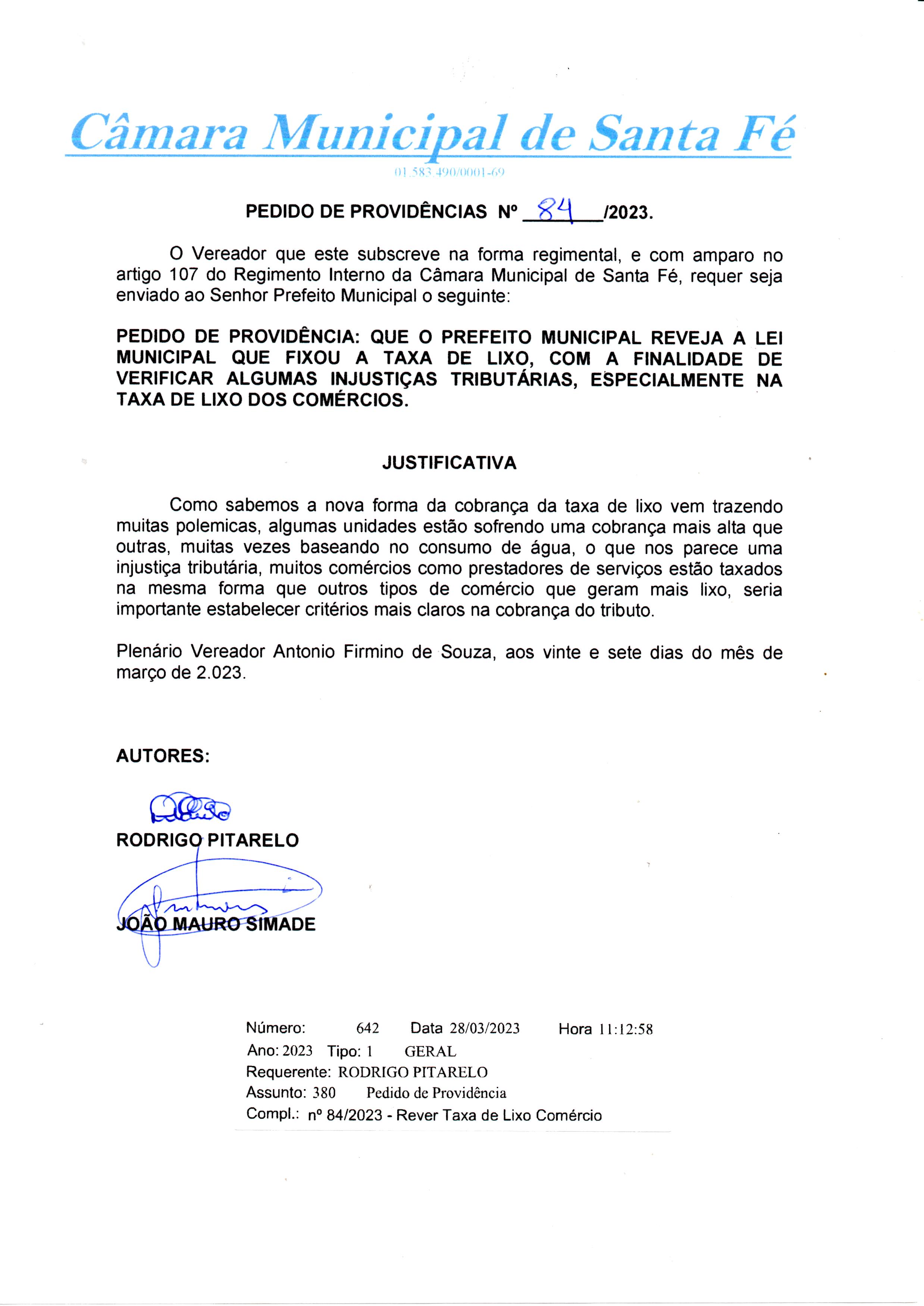 Que o Prefeito Municipal reveja a lei municipal que fixou a taxa do lixo, com a finalidade de verificar algumas injustiças tributárias, especialmente na taxa de lixo dos comércios.