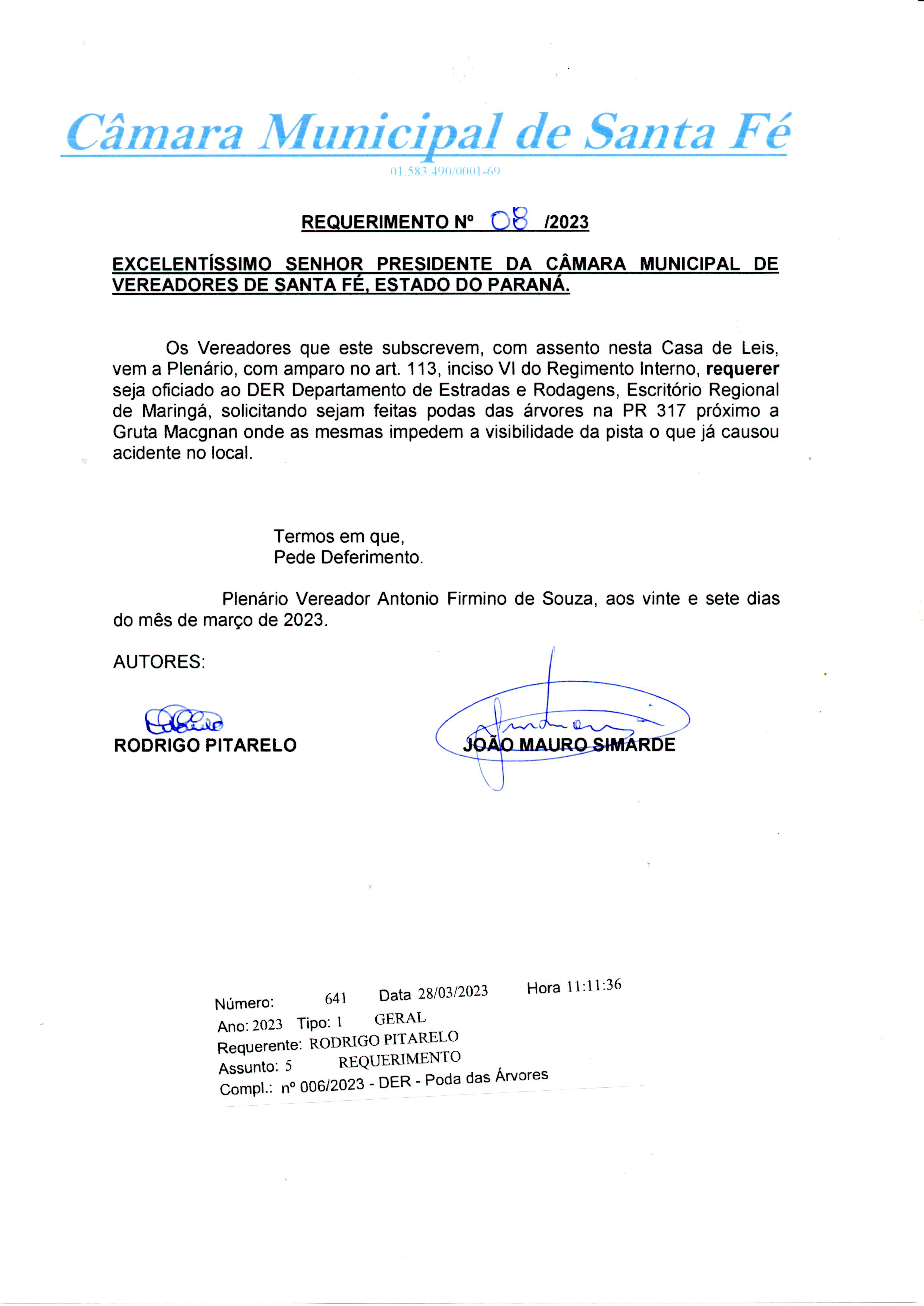 Requerer seja oficiado ao DER Departamento de Estradas e Rodagens, Escritório Regional de Maringá, solicitando sejam feitas podas das árvores na PR 317 próximo a Gruta Macagnan onde as mesmas impedem a visibilidade da pista o que já causou acidente no local.