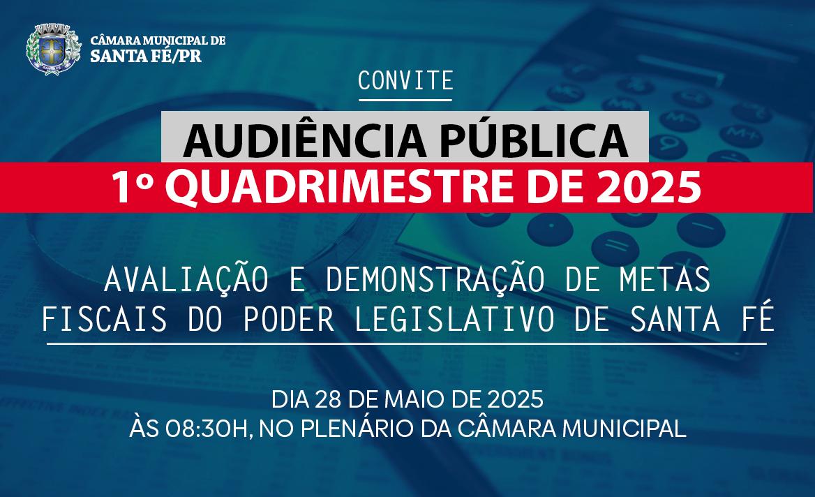 A Câmara Municipal de Santa Fé, em cumprimento ao que dispõe no artigo 48, parágrafo único da Lei Complementar nº 101/2000, convoca toda a população Santafeense para participar da AUDIÊNCIA PÚBLICA para AVALIAÇÃO E DEMONSTRAÇÃO DE METAS...